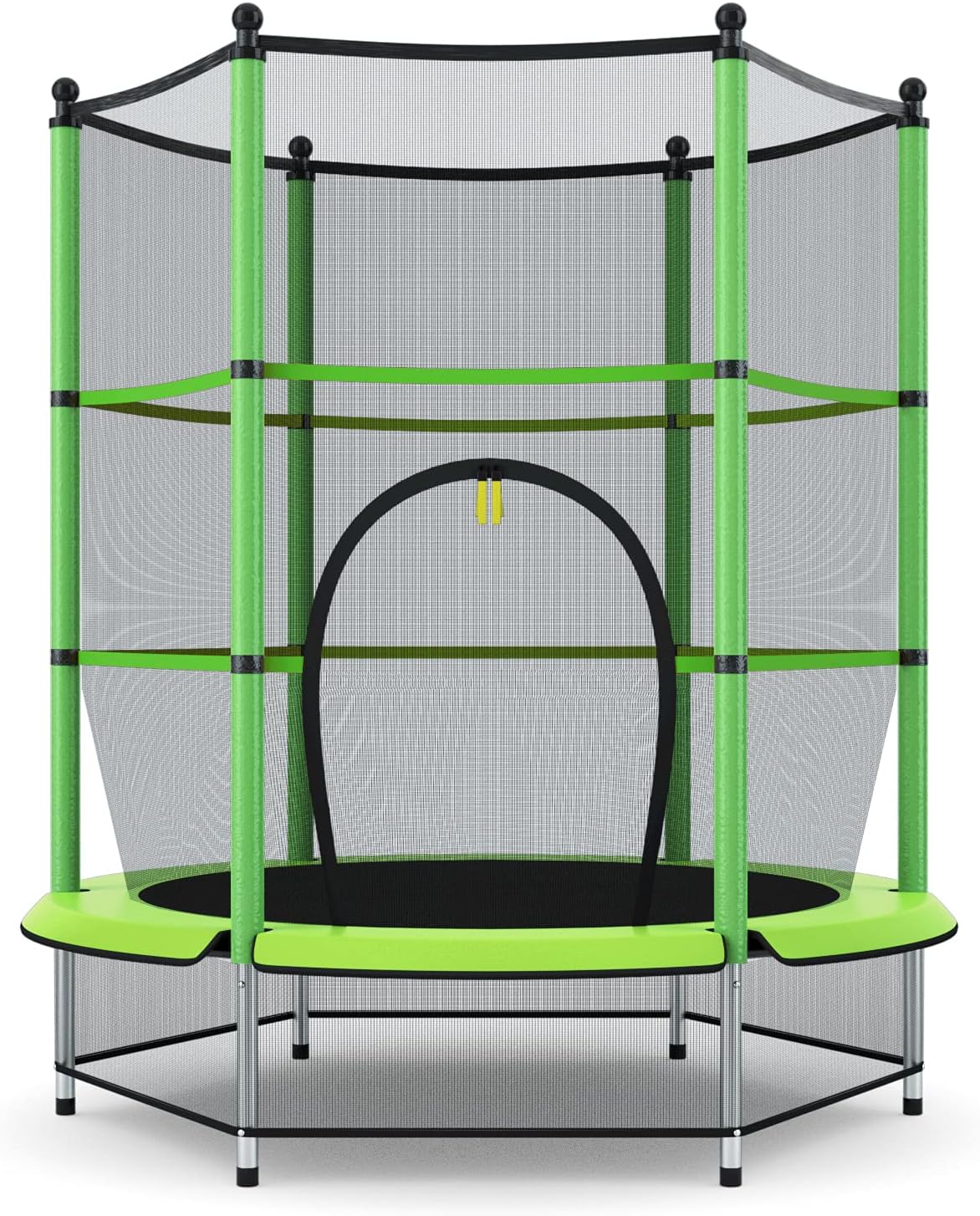 This trampoline features a 6-pole safety enclosure net to keep children safe as they play. And the lower enclosure net is designed to prevent babies or any objects from entering under the jump mat. The high-quality PP and PE jump mat is high-resilient, tear-resistant and waterproof for easy wipe cleaning. Durable bungee cords and safety pads provide a better jumping experience. Supported by a sturdy steel tube frame and non-slip foot pads, this small trampoline is stable and secure to use. Besides, the arched entrance with a double-sided zipper design brings more convenience for kids to enter or go out. Bring endless jumping fun together with health and fitness to your kids with this well-designed trampoline!